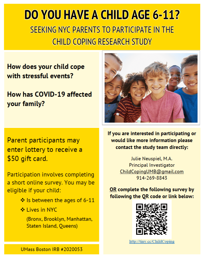 The “Child Coping” Study is interested in learning more about how New York City children cope with stressful events, with a focus on children ages 6-11 years (elementary school age). We are looking for parents/guardians of children in this age range to enroll in our study. Your participation will help us learn more about the experiences and coping skills of NYC children, as well as how parents may help children cope with stress. The research will cover topics like violence that your child may have experienced or heard about, as well as the impact of the COVID-19 pandemic on your family. We are interested in learning about the ways that NYC children cope with stressful events that are most helpful in their well-being.
